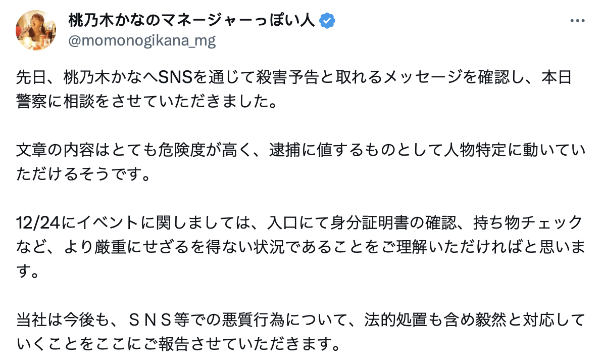 这⋯太糟糕了。虽然桃乃木及其经纪人并没有公布恐吓私讯的内容,不过这很明显碰触到之前「偶像遭恐怖粉丝残杀」的社会议题(不要和我吵AV女优算不算偶像,桃乃木不偶像这一行也没人是偶像了),所以就业界传来的消息是不只事务所警戒,警方也绷紧神经要保护她的安全ー我知道不办活动最好,不过桃乃木かな(桃乃木香奈)及其经纪人目前还没有取消的打算,只希望用这篇声明和严格的安检措施保护女优的安全〜