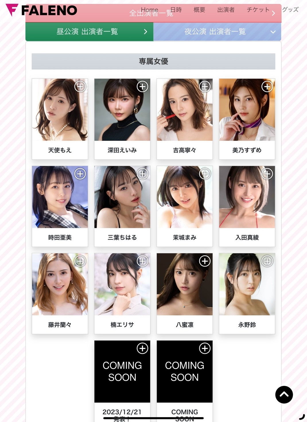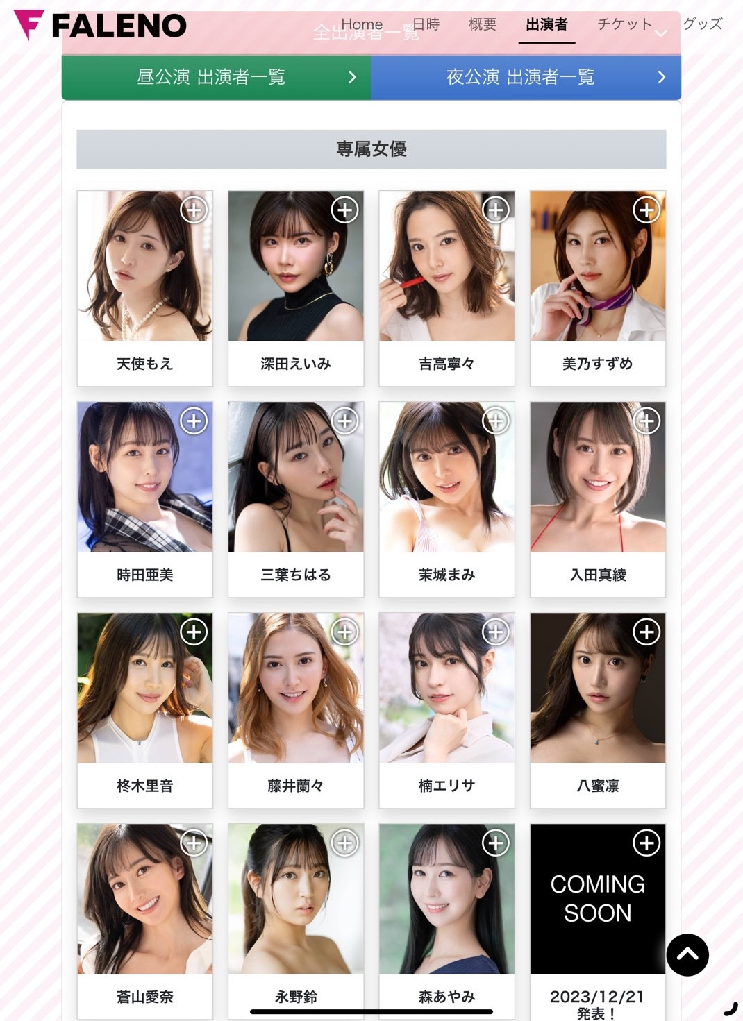 简单介绍一下活动内容,当天会分成早场(12:30~16:30)及晚场(18:00~21:30)的活动,女优会分别进行「ファッションショー(时尚走秀)」、「座谈会」、「ビンゴ大会(宾果大会)」、「オークション(衣服拍卖)」以及「グッズ贩売・购入特典会(商品贩售及物贩特典)」,内容看起来挺丰富的; Faleno也在官网(https://faleno.jp/top/faleno-fes/)公布了参加女优的名单,目前看来「入田真绫」、「苍山爱奈」、「森あやみ(森彩美)」以及「楠エリサ(楠爱里纱)」是只会参加一场活动的,如果你有兴趣去看看的话请先上官网做好功课〜