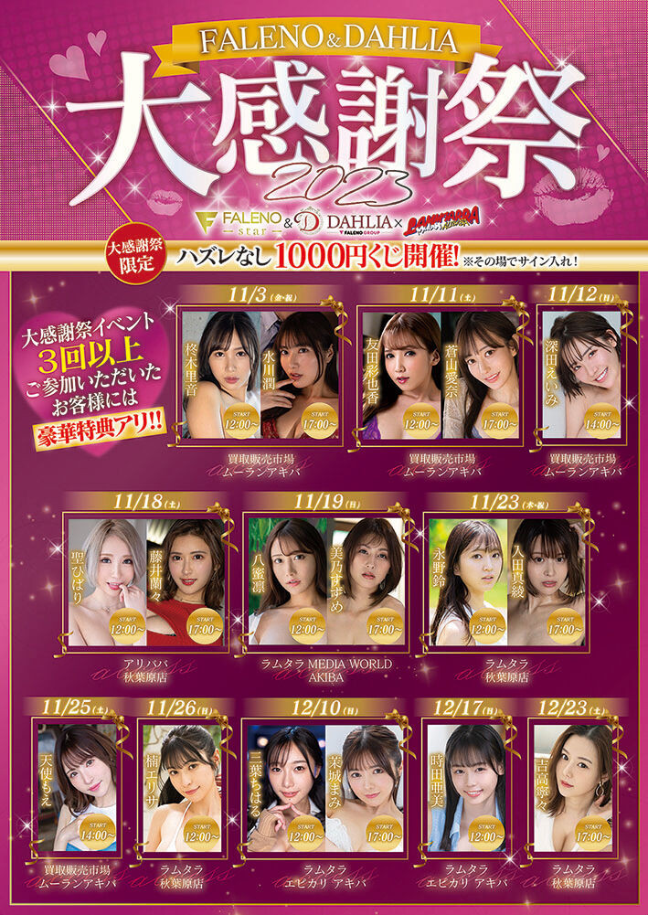 现在正是Faleno&Dahlia大感谢祭2023见面会的期间,两边的名单一比对你就知道哪些人没在Faleno FES的活动中出场:她们分别是圣ひばり(圣妃羽里)、友田彩也香以及水川润,再加上两边活动都没出场但12月仍然有作品上市的「五十岚なつ(五十岚夏)」,你说总共有20位女优参与活动好像很多,但实际算过就知道目前只有15位女优现身: